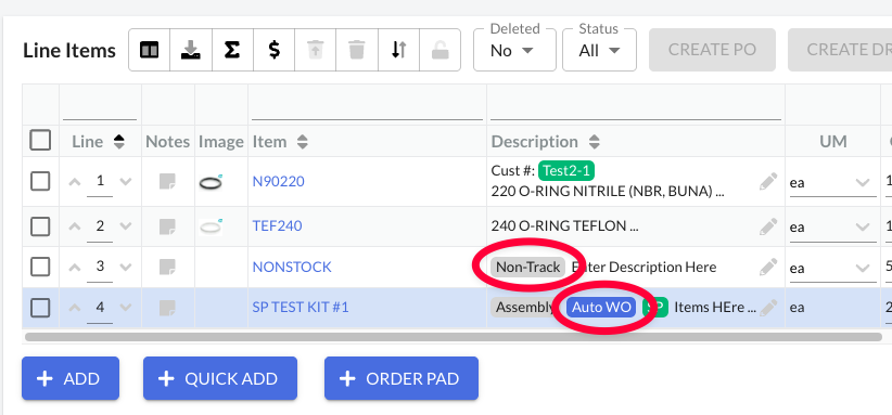 Auto WO&Non-TrackChip to Line Items: Chips were added to Line Items to clearly indicate if an Item is set as an Auto WO Item or a Non-Track/Non-Inventory Item for greater user visibility.