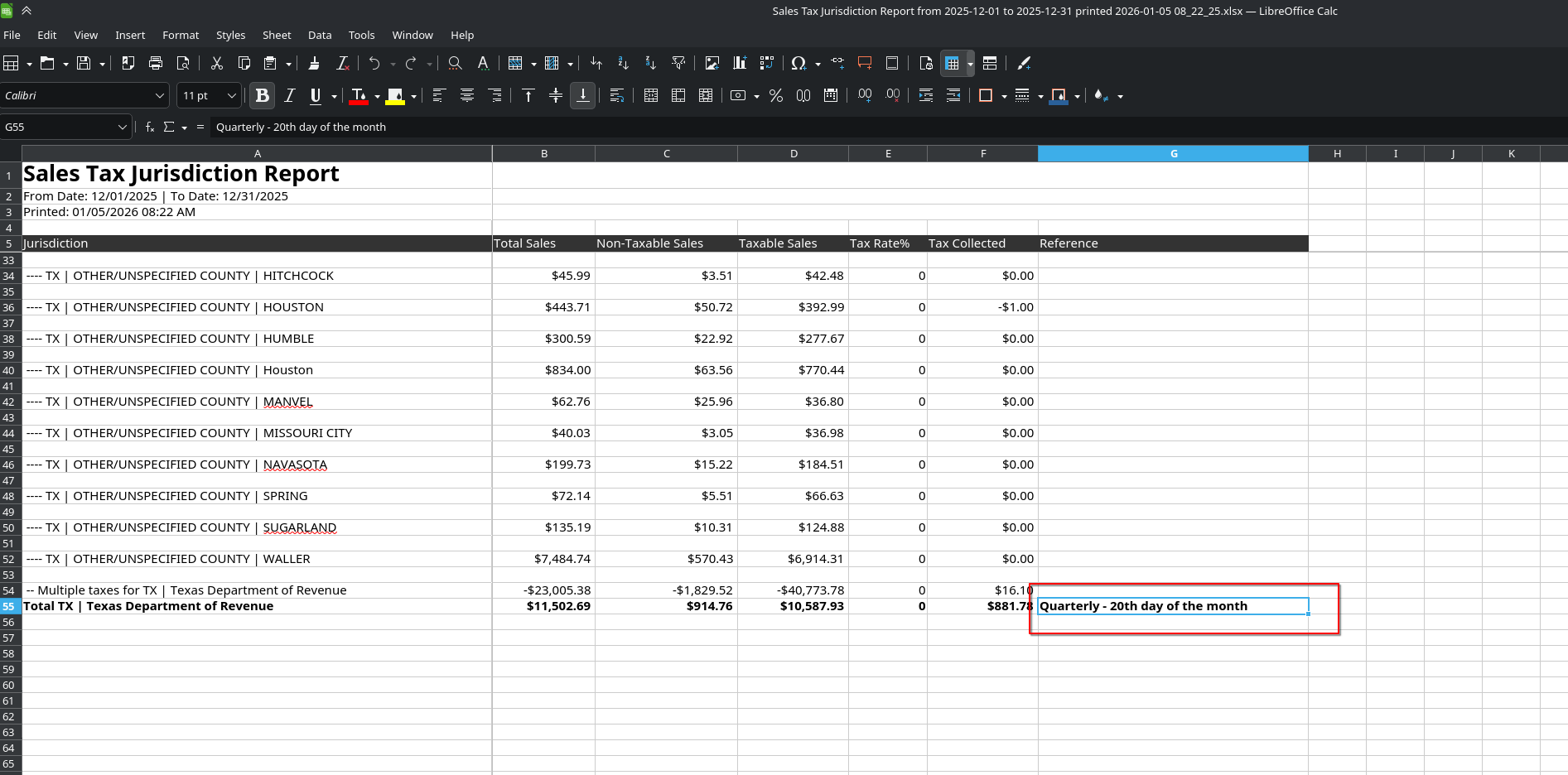 Referencefield was added to Sales Tax Rules, and included in the Import File and Jurisdiction Reports that are downloaded from 10X. This field can be utilized as needed for identifying Monthly or Quarterly Payment Date Requirements, or other information associated with the specific jurisdiction that would be helpful to see on the Sales Tax Reports.