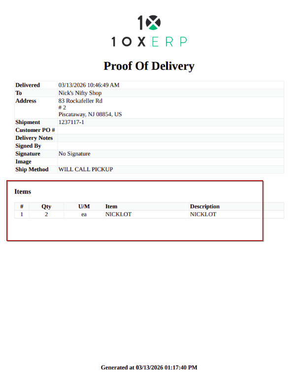 - Proof of Delivery (POD) Enhancements: Added a short summary of line items on the associated Shipment/Invoice to the bottom of the Proof of Delivery (POD) doc based on user feedback.