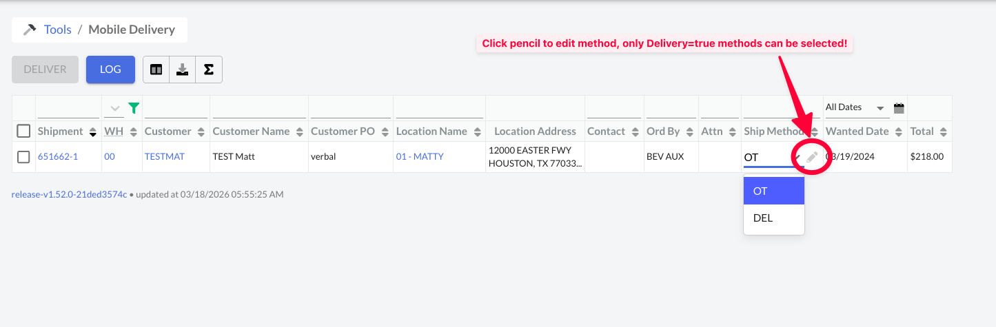 - Editing Ship Method on Mobile Delivery Tool: Users can now edit/change the Ship Method directly on the Mobile Delivery Tool, providing the method is a Delivery=true method in the Shipping Methods table.